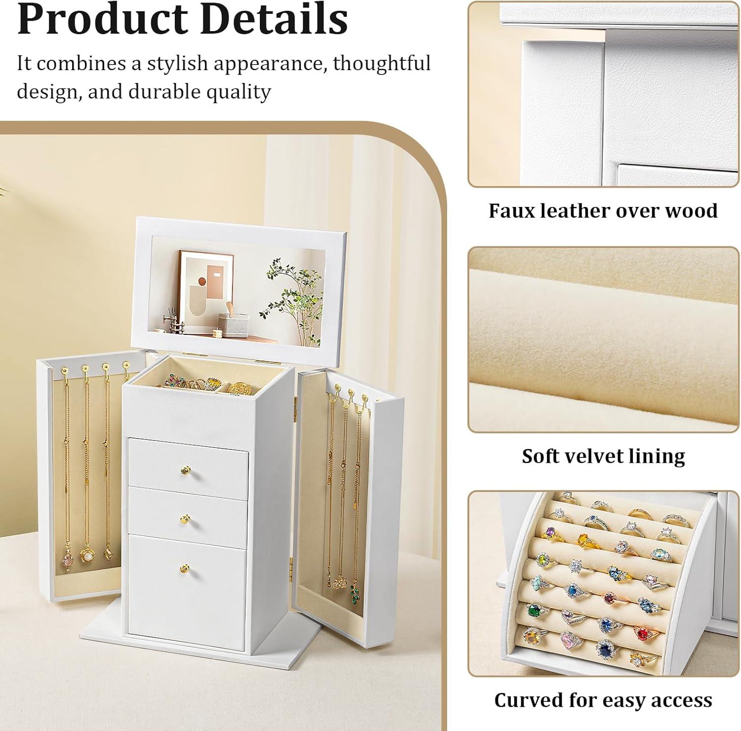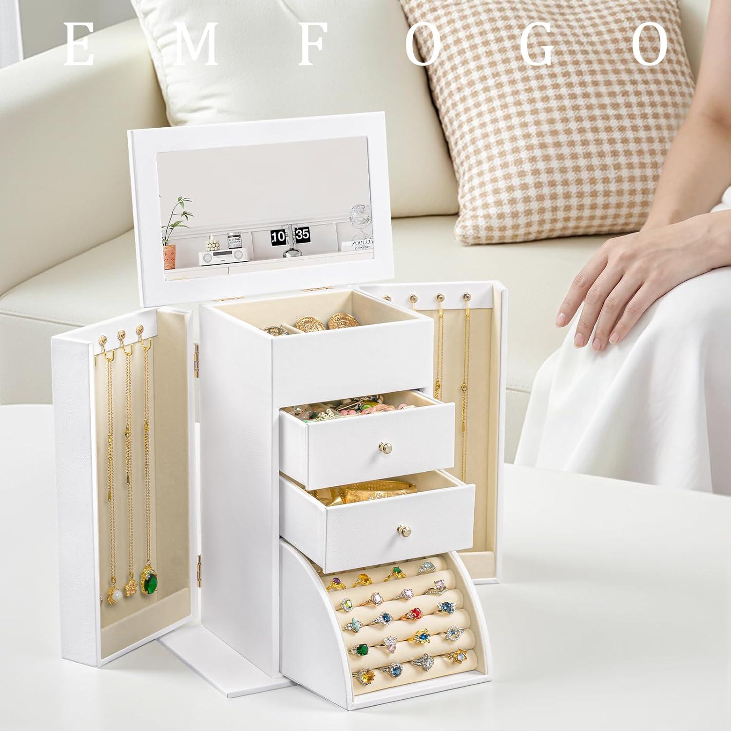 Emfogo Synthetic Leather Jewelry Box Organizer, Large Jewelry Boxes Storage with Mirror Velvet Interior, 4 Tier Jewlery Organizers for Women Girls Dedicated Slots for Ring Necklace (White)
